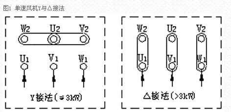 1、單速風(fēng)機(jī)接線方法:一般情況下,所配電機(jī)功率在3kW(包括3kW)以下為Y接法;3kW以上為△接法。接線圖如下: